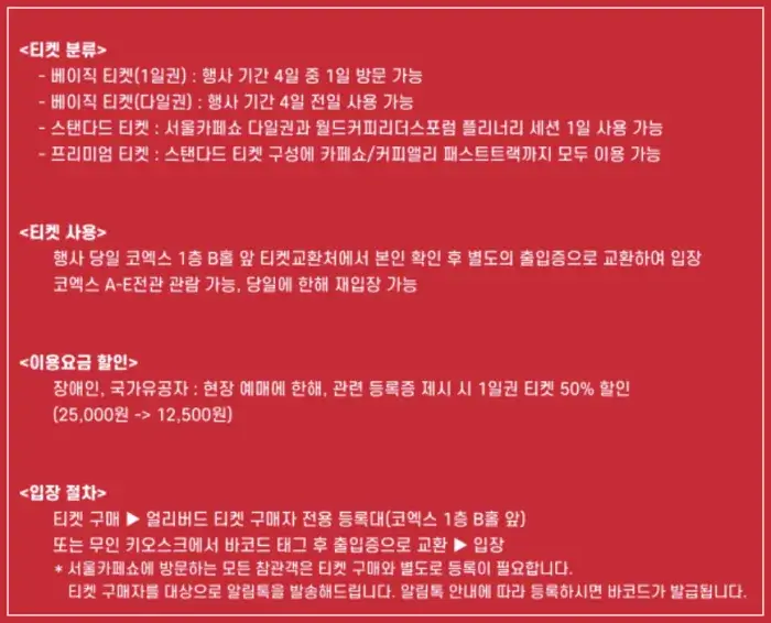 서울카페쇼의 티켓분류, 사용과 입장절차는 아래 이미지를 참고하세요.