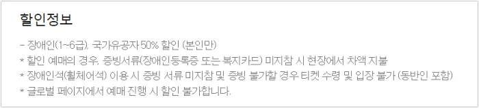 - 장애인석(휠체어석) 동반인 티켓을 예매하신 경우 현장 수령 시 예매자 본인과 동반인이 같이 방문하여야 티켓수령이 가능합니다.
