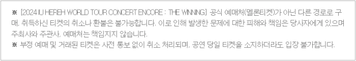 - 티켓 변경, 취소, 환불은 정해진 기간 내에 멜론티켓(공식 예매처)에서 규정에 의해 처리합니다. 공연 당일 변경, 환불이 불가합니다.
